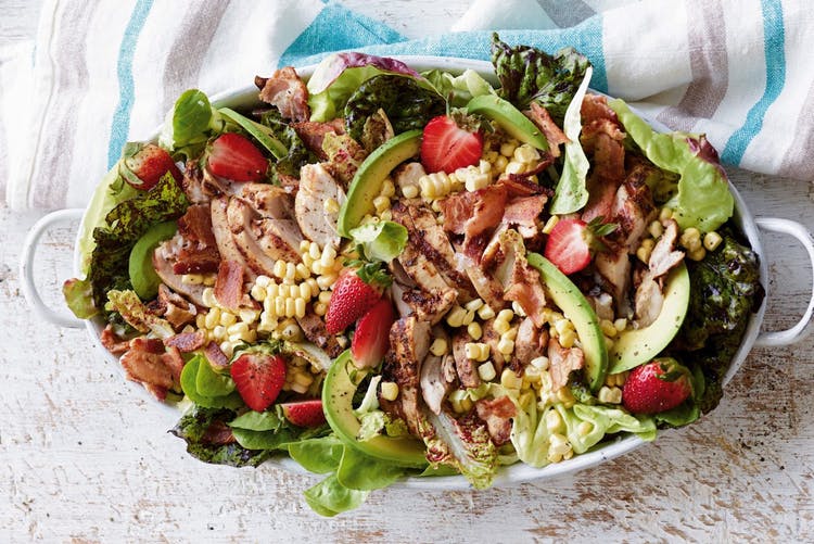 Arrange the salad greens on a large plate and add your toppings: bacon, strawberries, corn, avocado, and chicken.