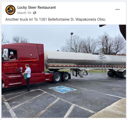 - The Lucky Steer Restaurant in Wapakoneta, Ohio is providing free meals and truck parking to all truck drivers who stop by. The Wapakoneta community has pitched in with donations to keep these free meals coming.