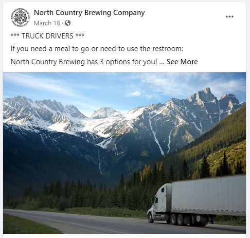 - The North Country Brewing Company in Slippery Rock, Pennsylvania is offering restrooms and take-out food at their three locations. If you’re driving through PA, make sure to keep them in mind for your next stop.