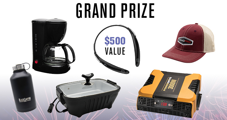 The Grand Prize Pack is filled with the latest product technology, that can help promote a healthy lifestyle for truckers. The 12-Volt appliances can be used to save money and allow for healthier meals to be cooked in your cab. The growler holds up to 64 oz. of water and will stay cold all day and the Bluetooth headset is great for listening to music while getting some exercise.
