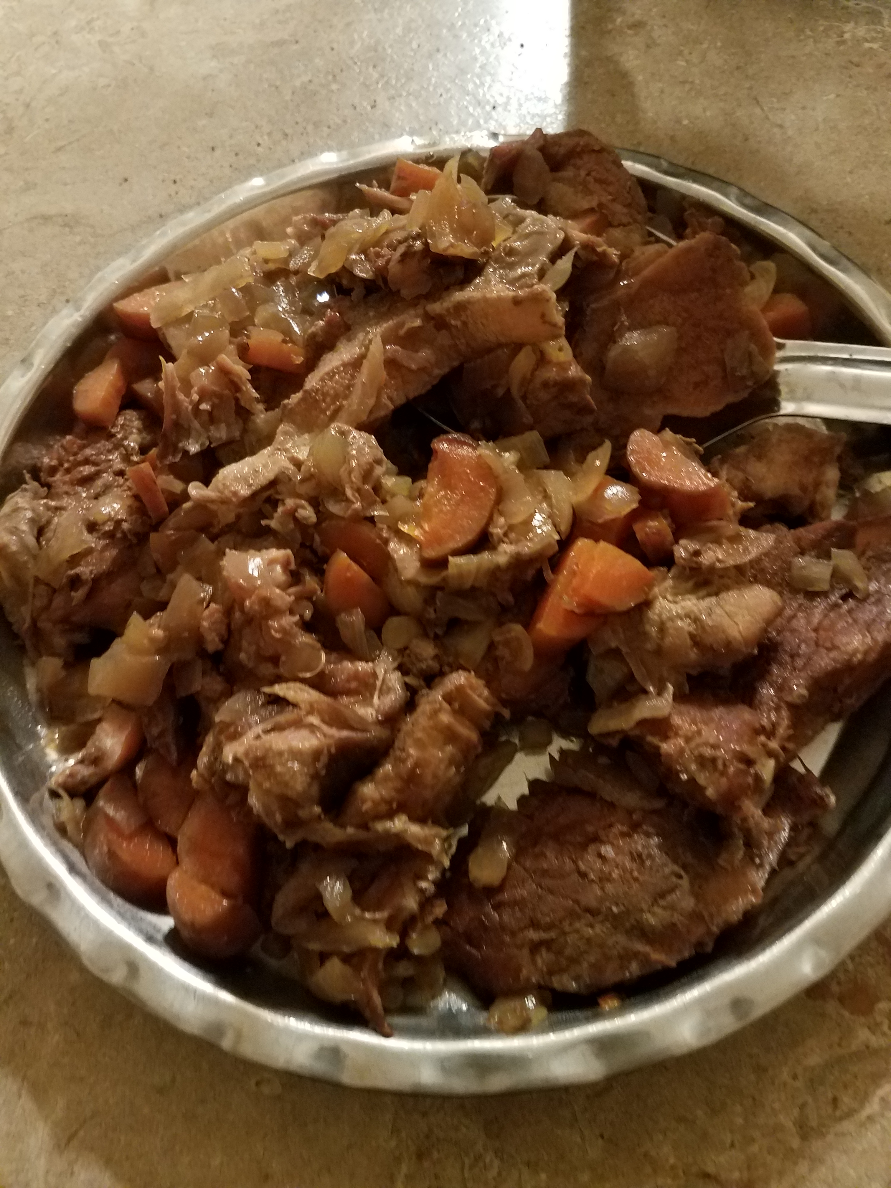 After thawing it, I put it in the pot, added one chopped onion and a large diced carrot, and filled the pot about half way with water. I cooked it in the crock pot for 5 hours. It was so tender it was falling apart. Oh! And the smell ……