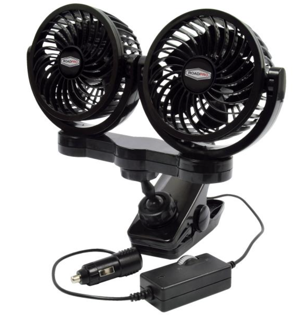 Staying comfortable while driving is key to staying alert and aware. Often that means staying cool. The 12-volt dual fan from RoadPro can help you stay cool. With variable speeds, the fully adjustable fan will give you the desired airflow. With a 7.5-foot-long cord and heavy-duty mounting clip, the fan can be placed where you most need it. It features a 12-volt fused plug to protect your truck’s electrical system. The 12-volt fan is available at most truck stops and online.